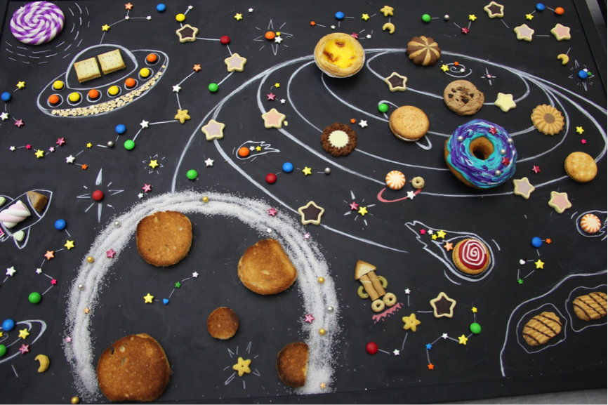 现场的展台上以各色甜点为元素拼绘出的行星运转、宇宙空间,也在向一个个来往的观众述说着充满人文和童趣的故事:地球的中心并不是个巨大的空洞,而是一个个家庭里的一个个厨房,而为人们所知的“食物”是人与人的连接最为重要的元素。